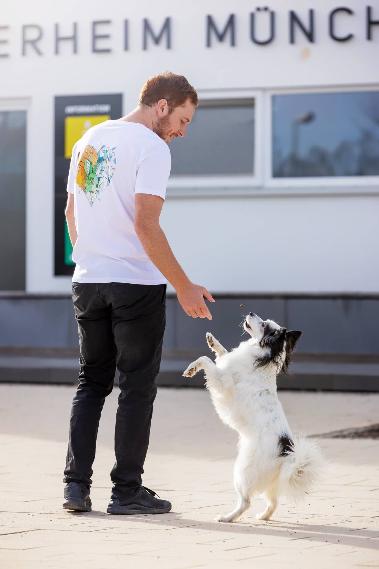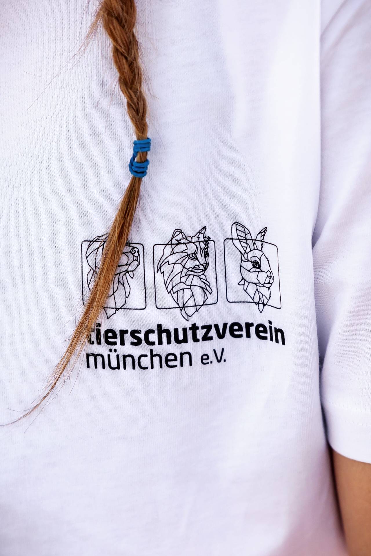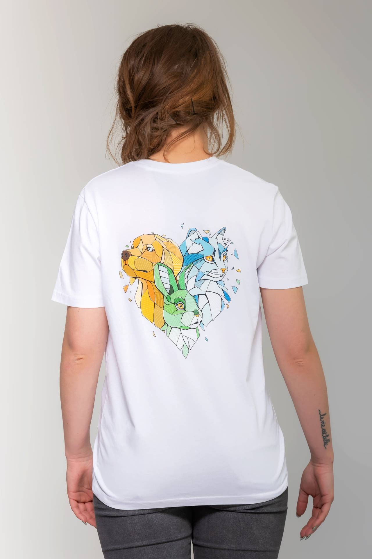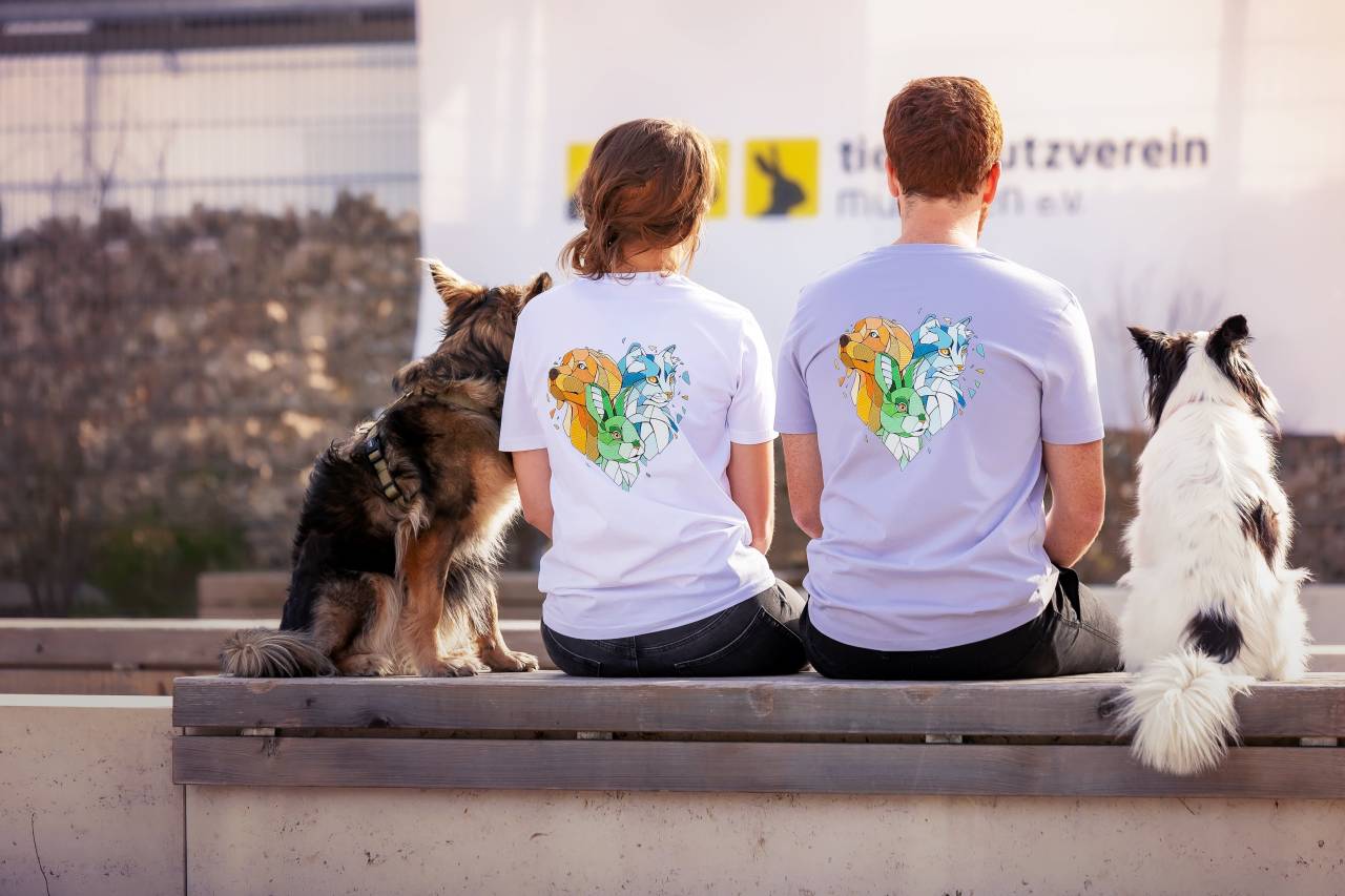 Rundhals T-Shirt aus 100% Bio-Baumwolle, kleines Tierschutzvereins-Logo auf der Brust und großes Motiv auf der Rückseite.